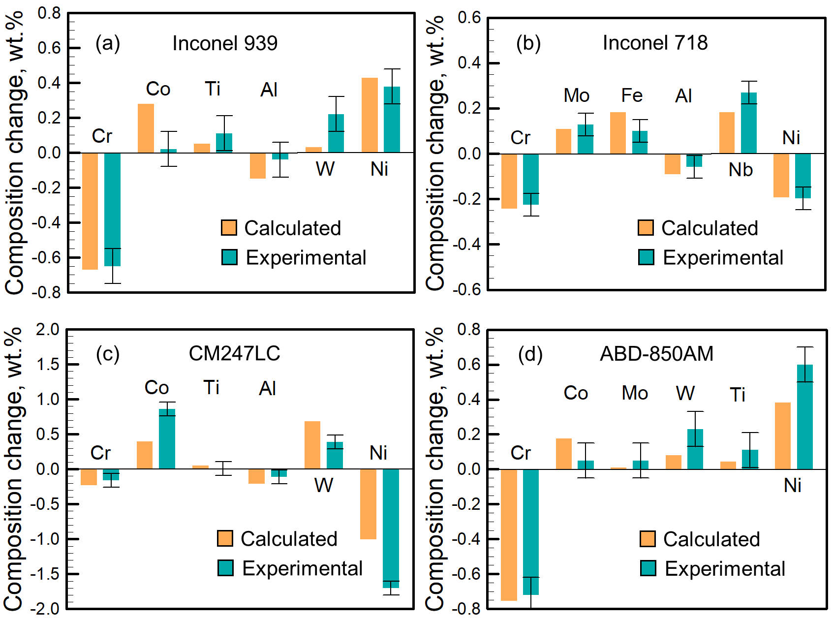 Figure 2: Comparison between the calculated and experimental composition change during LPBF of (a) Inconel 939, (b) Inconel 718, (c) CM247LC, (d) ABD-850AM. Experiments for Inconel 939, CM247LC, and ABD-850AM were done using 200 W laser power, 1.8 m/s scanning speed, and 30 µm layer thickness. The experimental results for Inconel 718 were taken from the literature [8] and the corresponding calculations were done for 300 W laser power and 200 mm/s scanning speed.