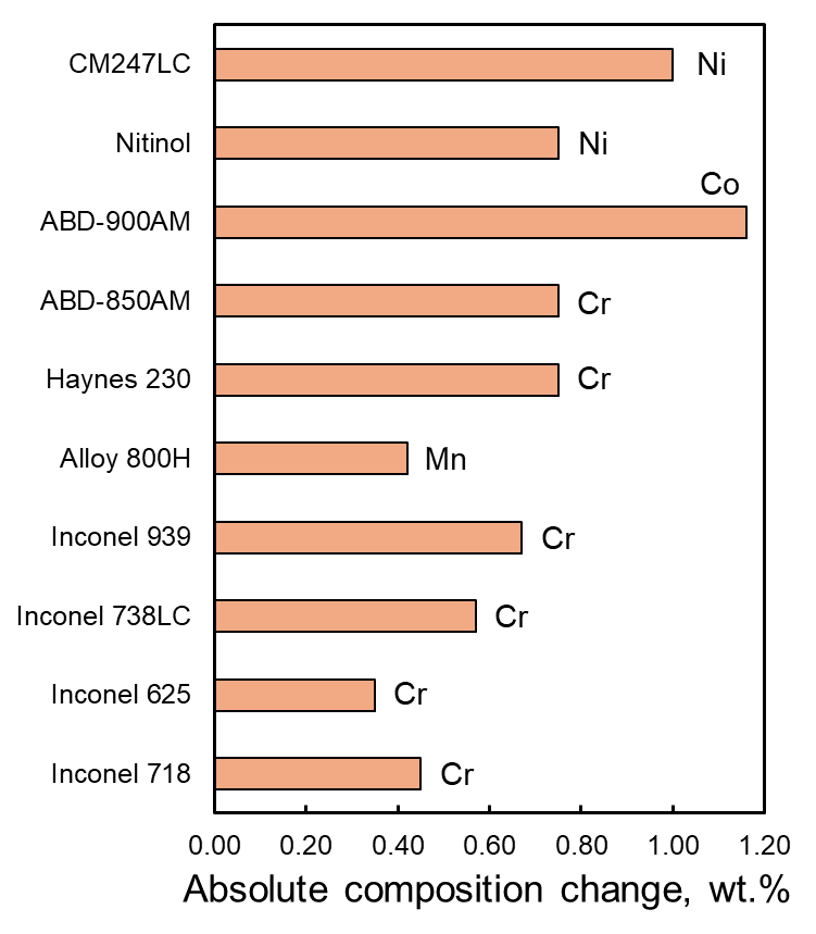 Figure 3: Absolute values of composition change for the most susceptible elements during LPBF of various nickel alloys using 200 W laser power, 1.8 m/s scanning speed, and 30 µm layer thickness.