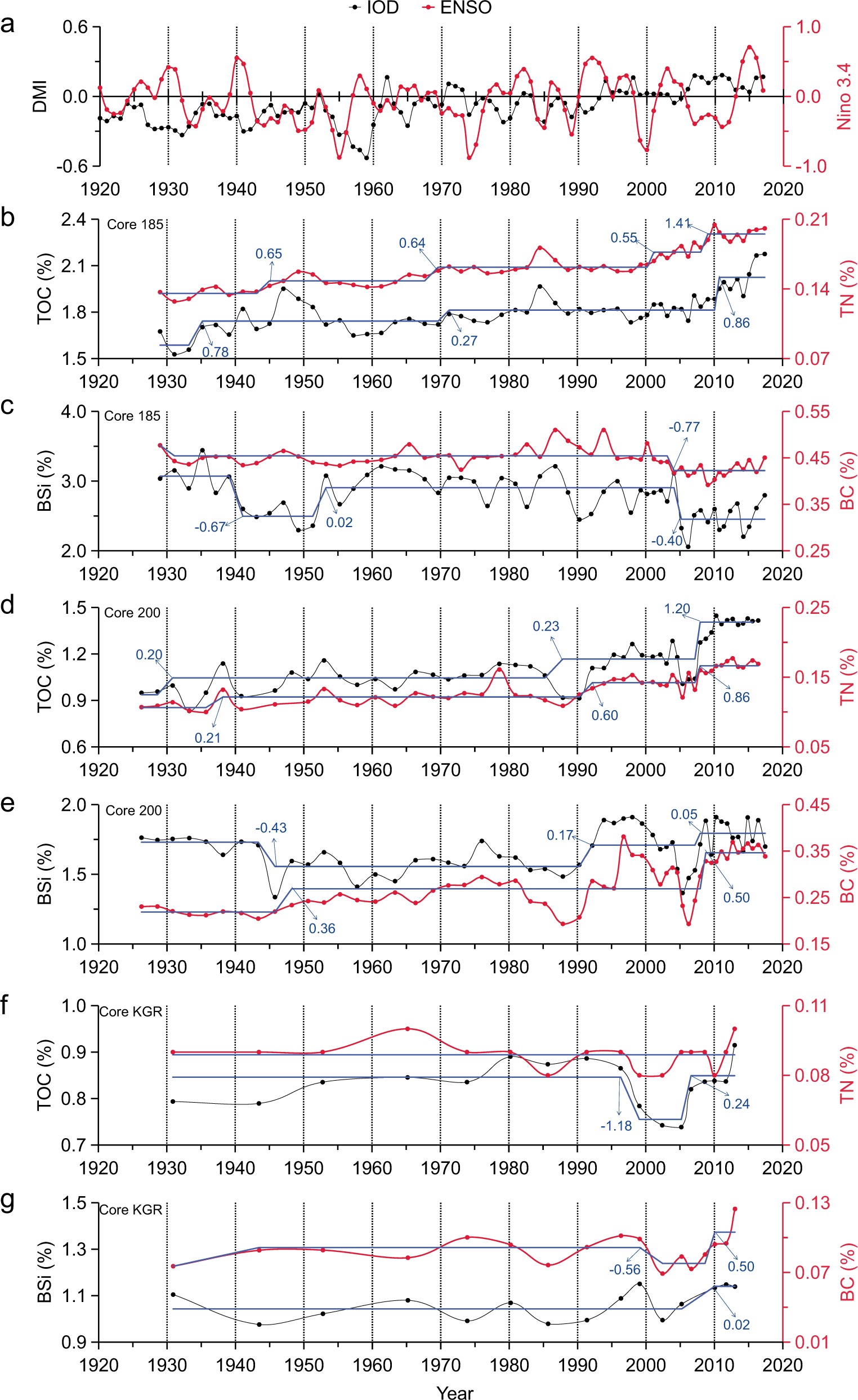 Fig. 2: The profiles to illustrate the variations of El Niño Southern Oscillation (ENSO), the Indian Ocean Dipole (IOD), and multiple geochemical proxies in the three sediment cores from the 1920s to 2010s. a Low-frequency signals of dipole mode index (DMI) and Niño 3.4 index showing the variations of IOD and ENSO, respectively. b Core 185: total organic carbon (TOC) and total nitrogen (TN). c Core 185: biogenic silicate (BSi) and black carbon (BC). d Core 200: TOC and TN. e Core 200: BSi and BC. f Core KGR: TOC and TN. g Core KGR: BSi and BC. Blue lines represent the shift changes assessed by sequential t test analysis of regime shift and numbers on lines were regime shift index (RSI) to show shifting magnitude.