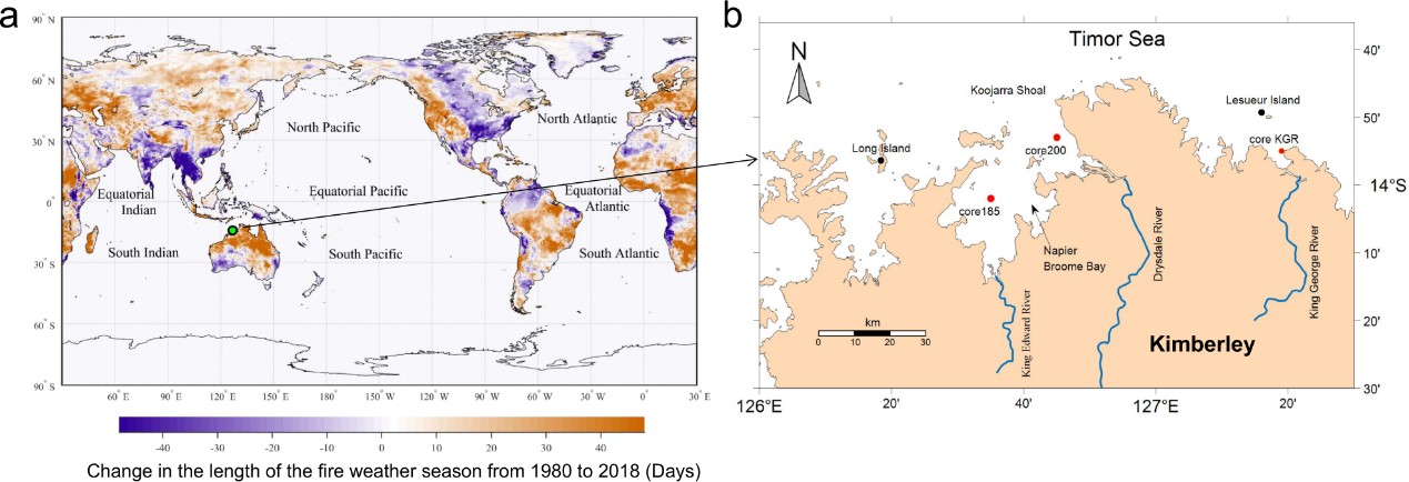 Fig. 1: Maps showing changes in the length of the fire weather season on a global scale and sampling location. a Map showing the change in the length of the fire weather season between 1980 and 2018, data from the ERA5 dataset (Jolly et al., 2015; Vitolo et al., 2020); the green circle indicates the Kimberley coast, a fire-prone region in northern Australia). b Sampling sites of core 185, core 200, and core KGR (red dots) in the Kimberley coast.