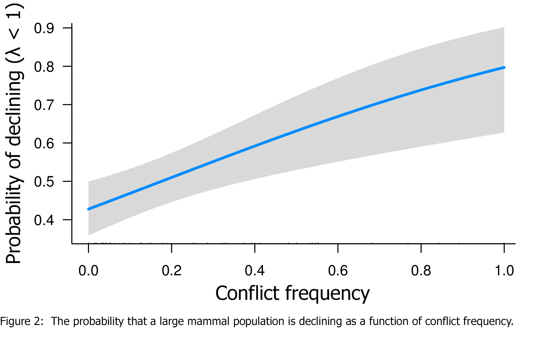 We found that the frequency of declining populations increased sharply with the frequency of conflict (Fig. 2). In addition, while the average population trajectory in peaceful parks was almost exactly at the level of replacement, as little as one conflict event in two-to-five decades pushed the average population trajectory below replacement!