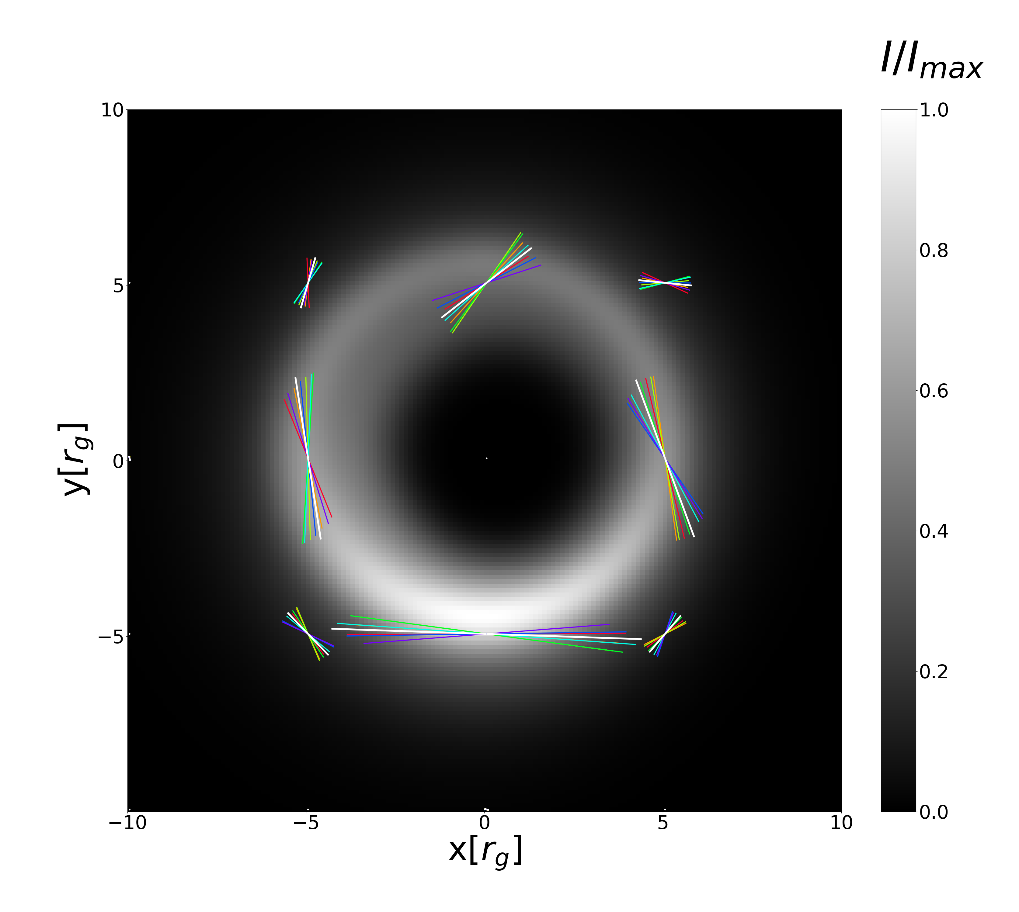 Figure 1: Illustration of the polarized emission from a Kerr BH surrounded by an axion cloud, using IPOLE. Different colors on the electric vector position angles (EVPA) quivers, which range from red through to purple, represent the time variation of the EVPA in the presence of the axion-photon coupling. White quivers are the EVPAs when the axion field is absent. The intensity scale is normalized so that the brightest pixel is unity.