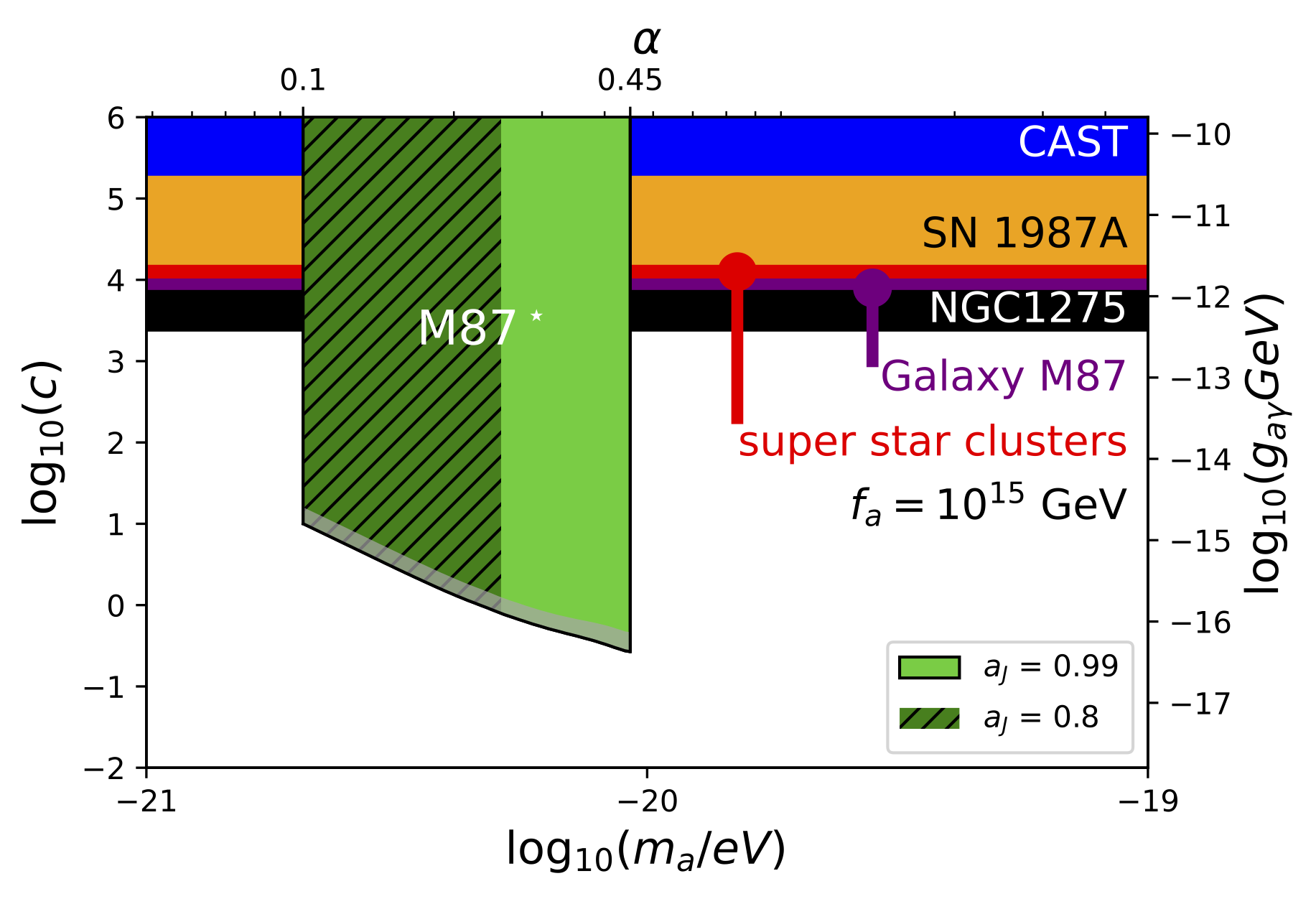 Figure 2: Our constraints on dimensionless axion-photon coupling c from the EHT polarimetric observations of SMBH M87* are shown. The black hole spin aJ is assumed to be 0.99 or 0.80. The latter case corresponds to a smaller mass window, overlapping with aJ = 0.99 cases in the lower mass region. The gray band at the bottom represents the uncertainty from the five different EVPA reconstruction methods. Previous bounds on axion-photon coupling are shown for comparison.