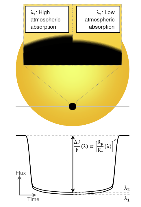Figure 1: Schematic representation of the basics of transmission spectroscopy. The flux drop during a transit is dependent on the wavelength observed as the planetary atmosphere has a wavelength-dependent capacity to attenuate the light from the background star. Figure from de Wit & Seager 2013.
