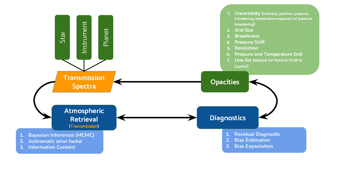 Figure 2: Framework for sensitivity analysis of retrieved atmospheric properties to opacity model. The four building blocks of the transmission spectra are shown in green, analysis techniques are marked in blue, and the orange highlights the remote sensing technique at the center of this perturbation/sensitivity analysis. The arrows are shown to indicate the direction of the information flow. Figure from Niraula, de Wit, et al. 2022.