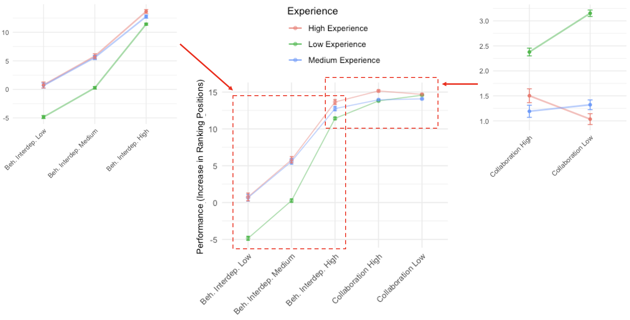 Interestingly, our results indicate that a player's experience could change this curve, suggesting that more experienced gamers might handle collaboration differently from novices. In other words, we found that when team members coordinate their actions closely, their teams generally do better. However, this benefit changes depending on how much experience the players have, introducing a fresh perspective on how teams can balance their members' interactions for optimal performance, depending on their familiarity and expertise. More in detail, with new teams, a tight approach to working together is linked to worst outcomes, but as teams get more experienced, the relationship between tight teamwork and success straightens out, improving performance. In summary, the study highlights the importance of finding the right balance in teamwork, especially considering the experience level of the team members.