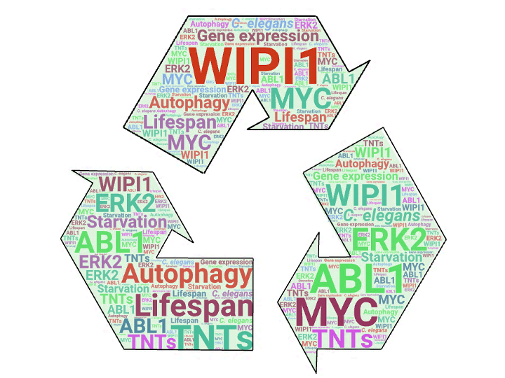 Figure 1. Word cloud for regulation of WIPI1 in autophagy with implications for life span control in C. elegans. Keywords (WIPI1, autophagy, lifespan, ABL1, ERK2, MYC, gene expression, TNTs) were derived from our study and used to create a word cloud with WordArt.com, using the recycling symbol to visually reference the process of autophagy.