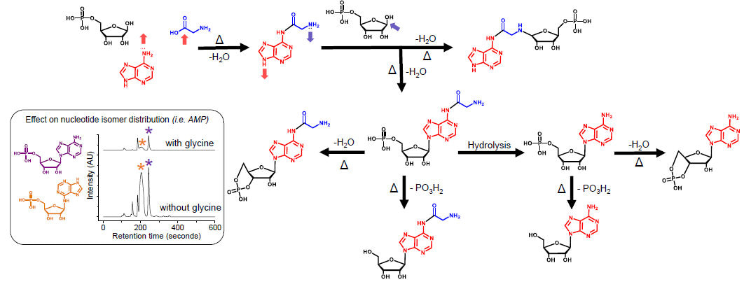 We decided to investigate the co-reactivity of amino acids (Glycine) and nucleotide building blocks (P-ribose and a nucleobase) under simple dehydration conditions (at 90 °C for 5 h). Our results showed that adding glycine to the reaction, has a stereo-selective effect on the glycosidic bond formation. This confirmed that the presence of other organic compounds in the reaction mixture, species suspected to be present in prebiotic broths, have the capacity to direct the isomeric distribution of the resulting nucleotides in a dehydration reaction. As well, exchange of nucleobases within and between nucleoside and nucleotide compounds indicated a dynamic environment of early-forming nucleic acid monomers.