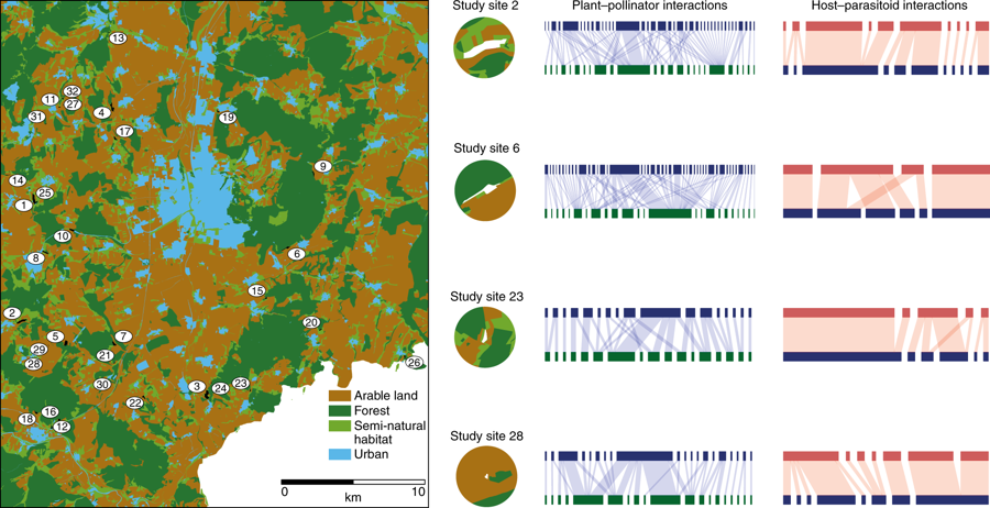 Past and potential future effects of habitat fragmentation on structure and stability of plant–pollinator and host–parasitoid networks