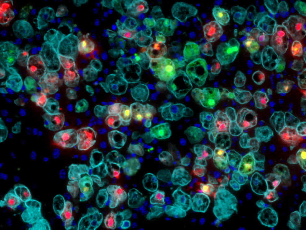 Immunofluorescence micrograph showing human hepatocytes (CK-18, light blue) infected with HBV (HBcAg, green) and with HDV (HD-Ag, red) within the mouse liver. All nuclei visible in dark blue (DAPI). Courtesy of M. Dandri.