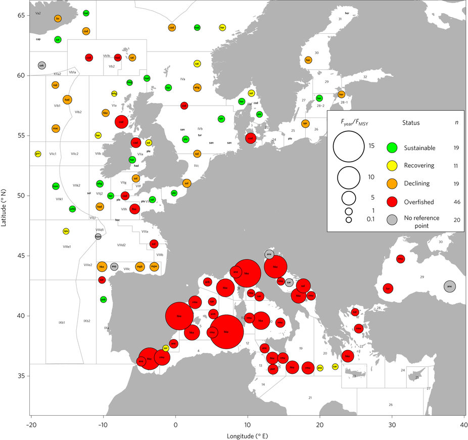 An assessment of the conservation status of 1,020 European marine fishes reveals half of large (>1.5 m) fishes are threatened with extinction. Also, stock status diverges geographically: almost all Mediterranean stock is overfished, whereas most northern European stock is not.