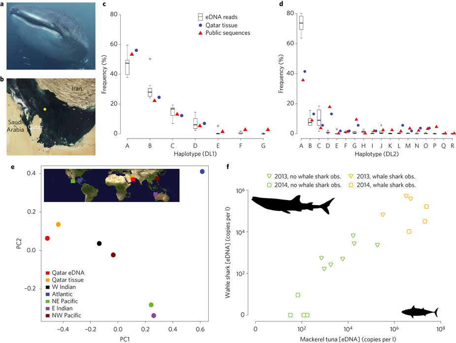 Environmental DNA from water samples can be used to detect the presence and abundance of aquatic organisms. Here, the authors show that it can also be used to obtain population genetic information from whale sharks in the Arabian Gulf. You can read the associated News & Views here.