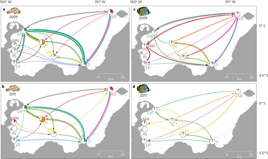 Larval dispersal of clownfish and butterflyfish across a 10,000 km2 area was tracked over 2 years, a large enough scale to inform the design of marine reserve networks and test their performance.