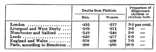 For the causes of consumption among women, Thompson notes that the number of cases increases in proportion to the number of illegitimate births in a given city. For it “will hardly be disputed that, in any district notorious for the number of children born out of wedlock, there will the women be least happy in condition, most exposed to hope deferred, unrequited affection, [and] bitter ingratitude.” (8) With moral depravity comes physical decay for women of the lower classes, a fact that Thompson incontestably proves with the following chart. The columns on the left show the number of deaths from ‘phthisis,’ or consumption, and the columns on the right show the respective percentage of children born illegitimately (“unavoidably from a different year,” as Thompson notes, but scientific nonetheless (9)).