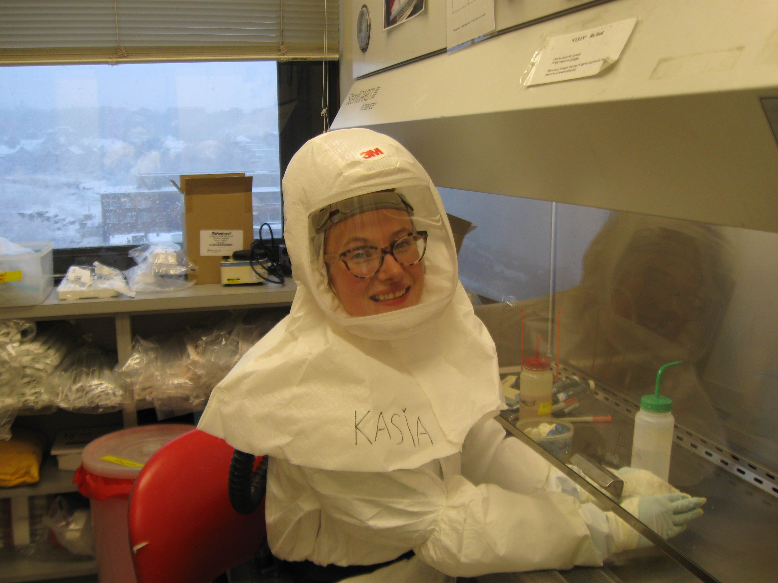 Besides the time it takes for Mtb to double (~24 hours), one cannot simply hop into lab and start an experiment- you have to be specially trained and you have to suit up. And I’m not talking about herringbone 3 piece suits here. I mean suit up in PPE (personal protective equipment)-tyvek suit, booties, tyvek sleeves, respirators with batteries and filters, double gloves… (see photo). Working in a biosafety level 3 is challenging, but it also creates a community based around teamwork. I've really enjoyed the camaraderie it fosters.
