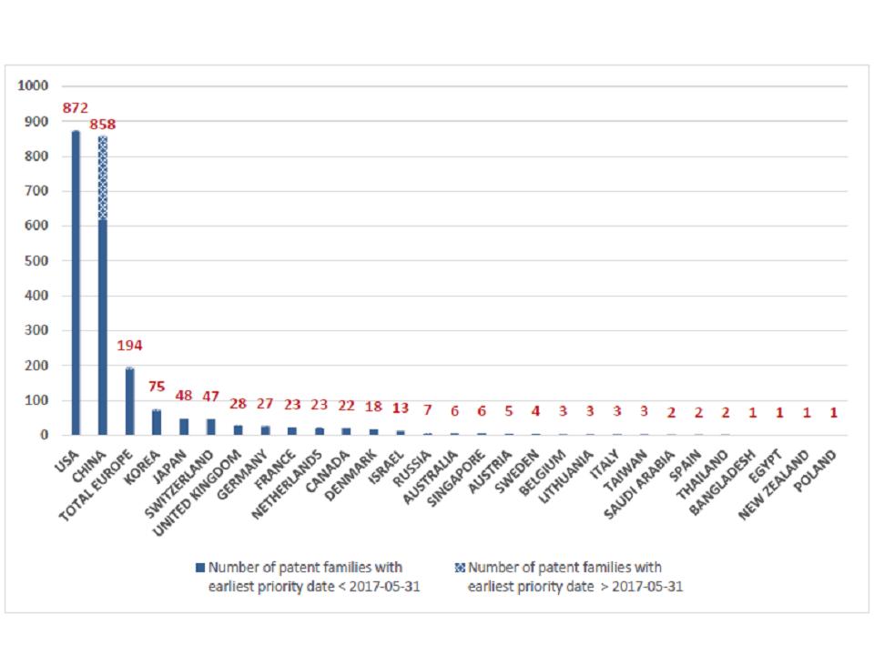 CRISPR patents were originally filed by 28 countries. USA and China are clearly the leaders with 872 and 858 patents, respectively. See graph below.