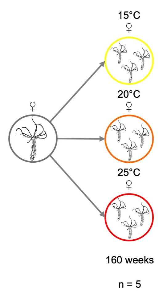 In this long-term experiment, we monitored the anemones under changing environmental conditions for more than four years. Our 750 anemones (50 animals X 5 boxes X 3 temperatures) were all clones derived from a single individual and therefore genetically identical. We divided the animals into three experimental groups to analyze their performance under their optimal/current conditions (20°C), possible future warmer conditions (+5°C), and a cooler control (-5°C). During the experiment, the animals showed several physiological differences. The animals kept at the higher temperatures increased both their sexual and asexual reproduction rates compared to the animals kept at 15°C, and as a result, became much smaller than the cold-acclimated animals. Notably, tolerance to heat stress (exposure to 40°C for 6 h) was much higher in the animals acclimated at 25°C than in the other two groups, and these differences increased along with the acclimation duration.