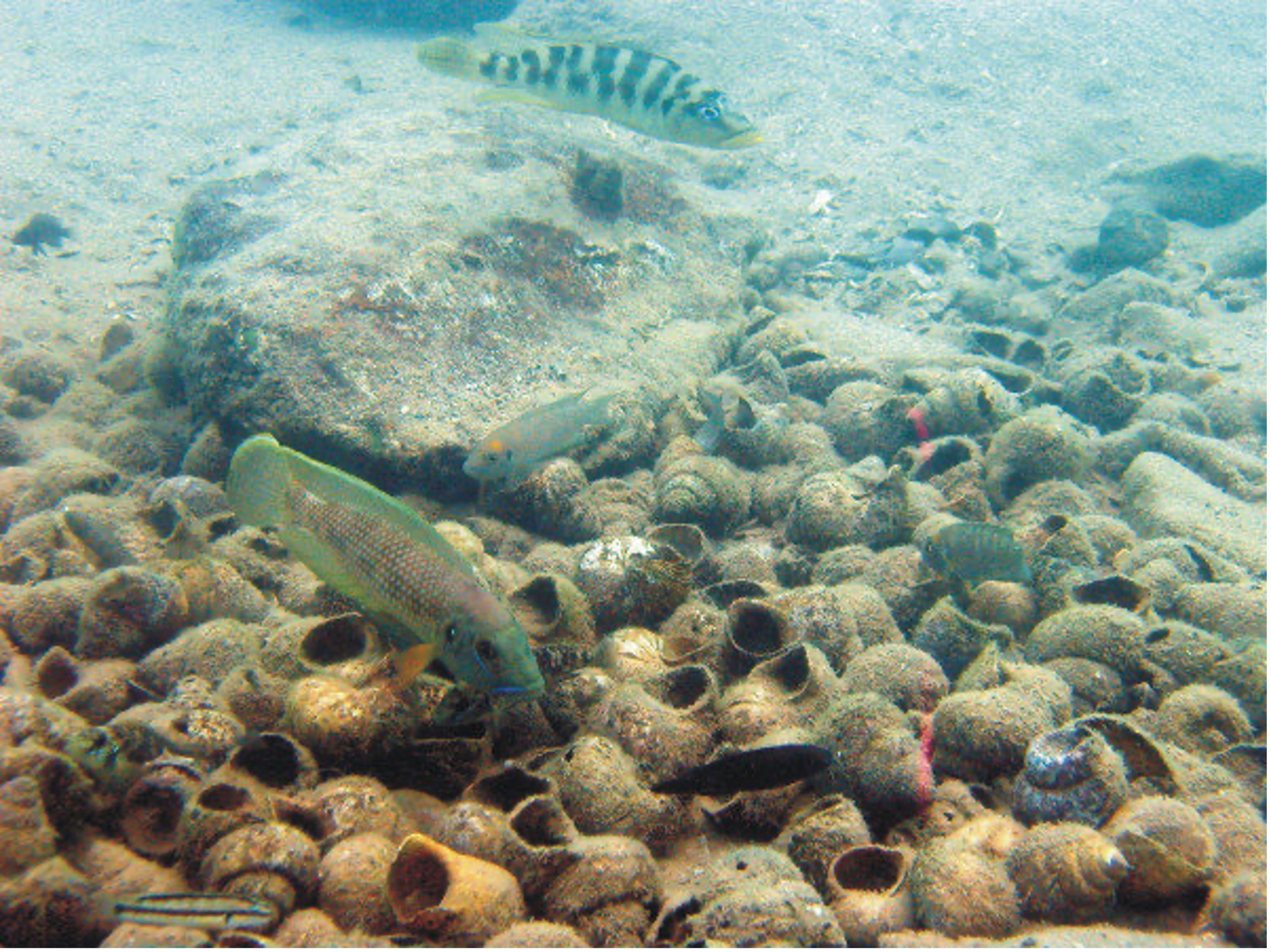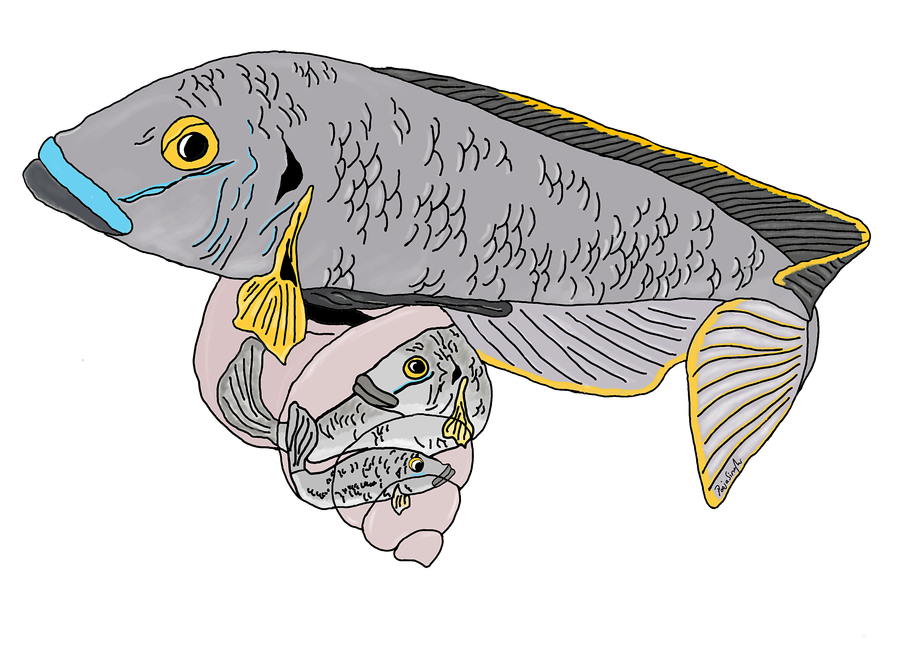 Michael and Barbara Taborsky, both professors at the University of Bern in Switzerland, were visiting my PhD supervisor Christian Sturmbauer at the University of Graz in Austria, which is when they told me about the L. callipterus system starting with the fact that the ‘bourgeois’ males of this species are 12 times bigger than the females 1! The reason for this body size difference is because this species uses empty snail shells found at bottom of the lake to build nests, so males must be large enough to carry shells with their mouths 2. Once nests are built, bourgeois males court females to join their nest. Females need to be small enough to fit inside the snail shells to lay eggs and in this way the eggs are also protected from predators. Differences in body size are important for the biology of this species as small males would not be able to carry empty snail shells and large females would not be able to enter shells. The snail shell brooding imposes ecological and evolutionary body size constraints.