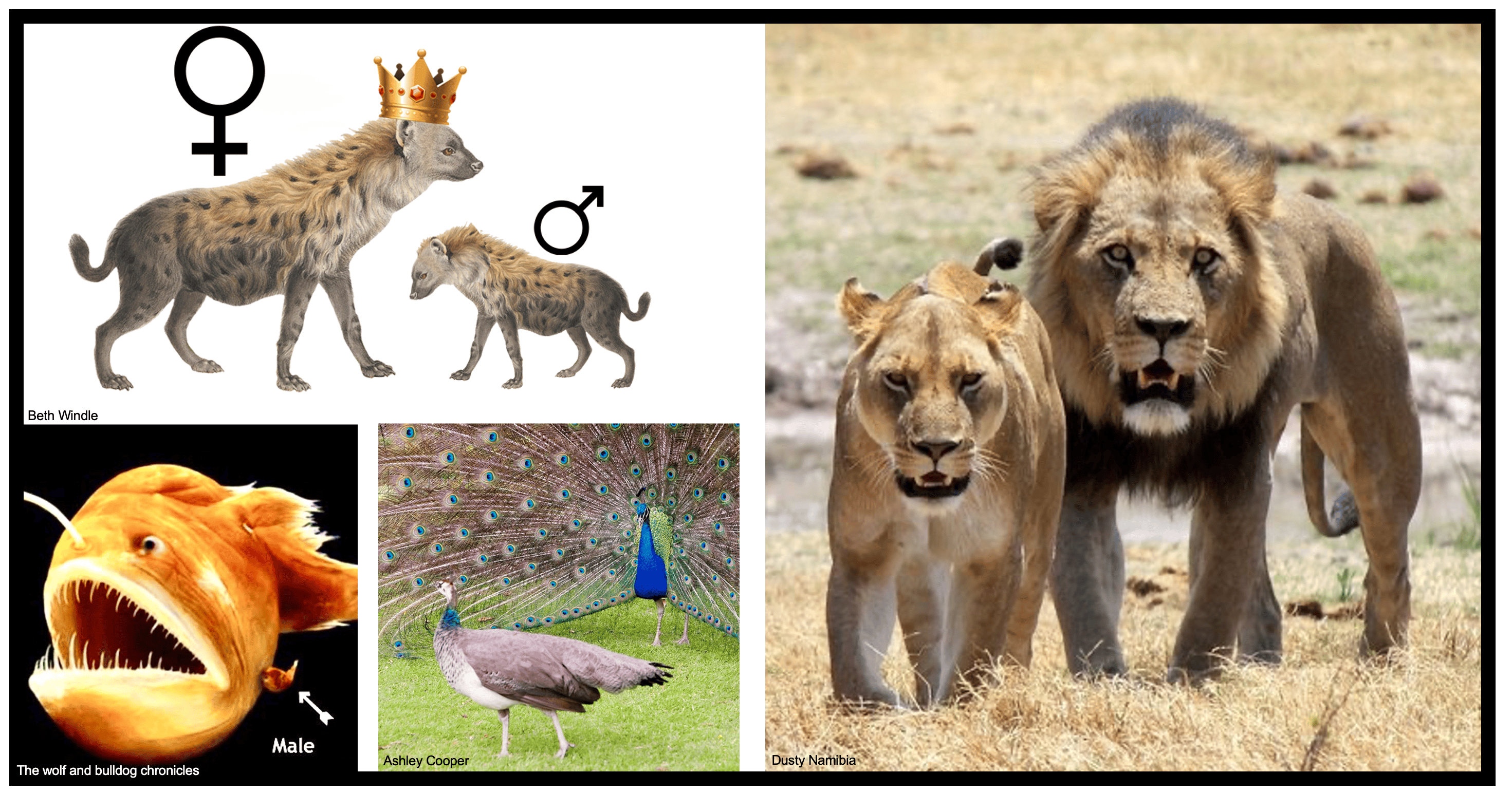 Differences in morphology (or sexual dimorphism) between males and females are common across the animal kingdom and are also found in some plants. For example, in birds such as pheasants or peacocks, males have colourful plumage while females are dull in comparison. Or back home in Botswana, male lions have gorgeous manes while females do not, or spotted hyenas where females are larger than males. The most bizarre example of sexual dimorphism of course would be the triplewart seadevil anglerfish where females are 24 times the size of the tiny parasitic male who literally attaches himself to the female during reproduction…eek. Okay back to my story.
