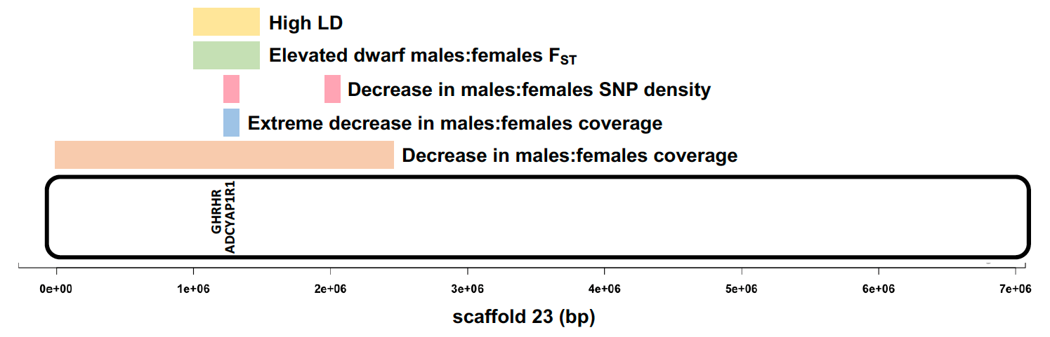 Armed with faith in the power of high coverage whole genome data, I went ahead with the analyses. I, of course, found almost no differentiation between the males and females… except for a small region on scaffold_23 that had reduced mapped read coverage in males. I was sceptical of this outlier region. However, Katie Peichel, who is a professor at University of Bern, and a collaborator on this project saw my results immediately asked if I had normalised the coverage. I had not. After normalising the coverage, the outlier region was more extreme and it appeared consistently in the comparison of both males versus the females, suggesting that this Y sex chromosome region was shared by both male morphs. When I zoomed into this Y chromosome region, I found GHRHR, a famous growth hormone regulator gene. Mutations of the GHRHR cause dwarfism in humans and the little mice phenotype. This was my eureka moment. I further scrutinised this region with various statistics and population genomics metrics. Linked to GHRHR, I found several candidate genes for sex determination, behaviour and sex-associated phenotypes in the L. callipterus Y chromosome. These genes could collectively be acting like a supergene. Even though the Y chromosome was shared by the bourgeois and dwarf males, they clearly carried two different Y haplotypes, which might explain the differences in the morphology and behaviour of bourgeois and dwarf males’ reproductive tactics.
