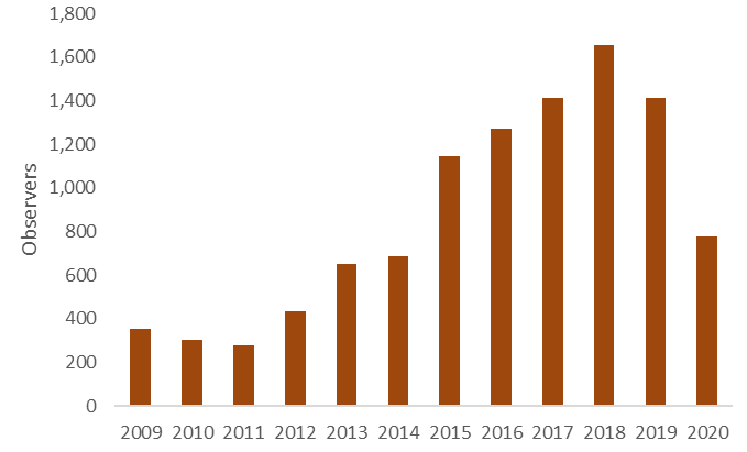More troubling, in April of this year, we experienced a significant drop in participating observers. The number of individuals submitting data in April 2020 dropped to 775 - nearly half the numbers in April 2019, 2018, and 2017.