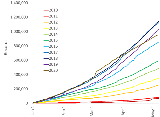 The patterns in Nature’s Notebook participation in recent months were at first discouraging. In the beginning of March of 2020, more observations were contributed than in any previous year. But in mid-March, once the stay-at-home orders started to hit, the rate of incoming records started to wane, and the taper has continued through the beginning of May. By May 1, we were 2% behind 2019 in records accumulated since the start of the year, and 12% lower than where we were at by this time of the year in 2017 and 2018.