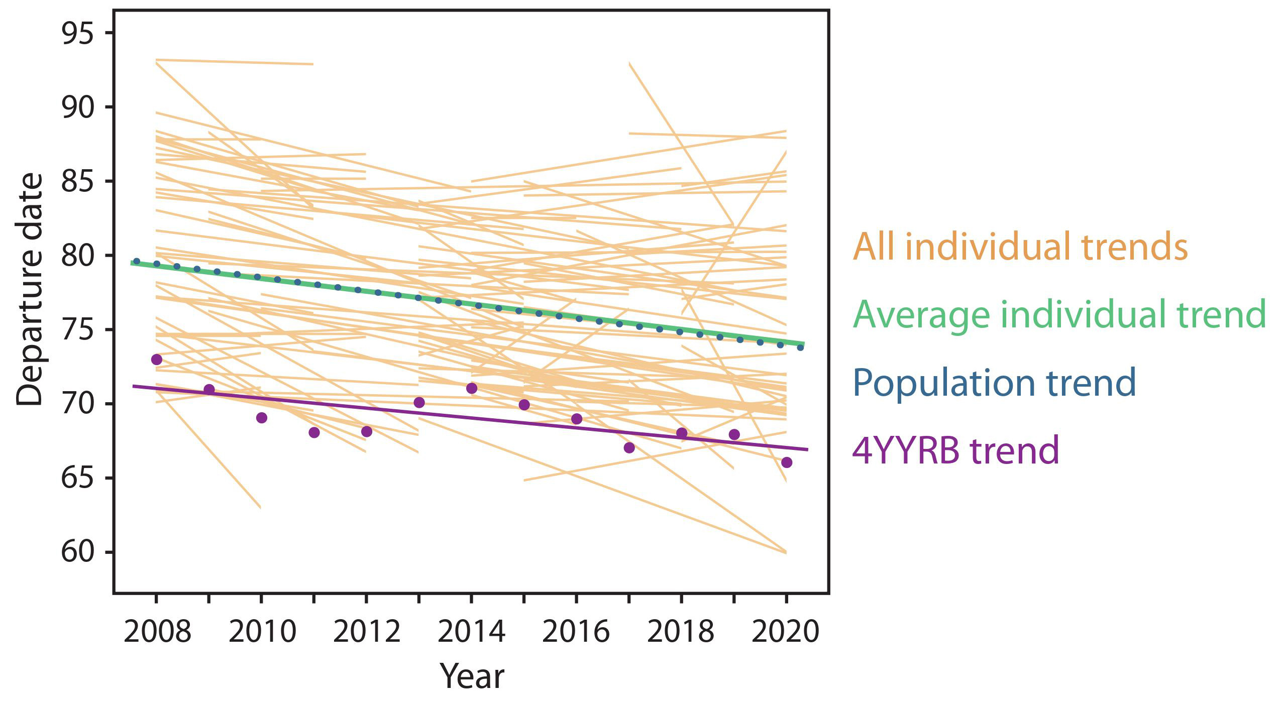 By collecting similar data for all of his individually-marked compatriots at the Manawatu (a total of 124 that graced the study for at least 3 years), we could see that 4YYRB was not an exception but the rule: the population advancement occurred through individuals changing their timing. This is an encouraging message regarding contemporary adaption in long-distance migratory birds, which are often thought to be relatively unresponsive to change, either because their tightly-scheduled itineraries have little wiggle-room, or because relevant cues don’t reach them from opposite ends of their journeys. And adult birds, in particular, are often observed to be quite set in their ways, once they figure out a routine they like. But our results show that their toolbox for adaptation to change includes year-to-year refinement to changing conditions (and perhaps learning by experience), not just evolutionary change through selection and replacement by better-adapted individuals.