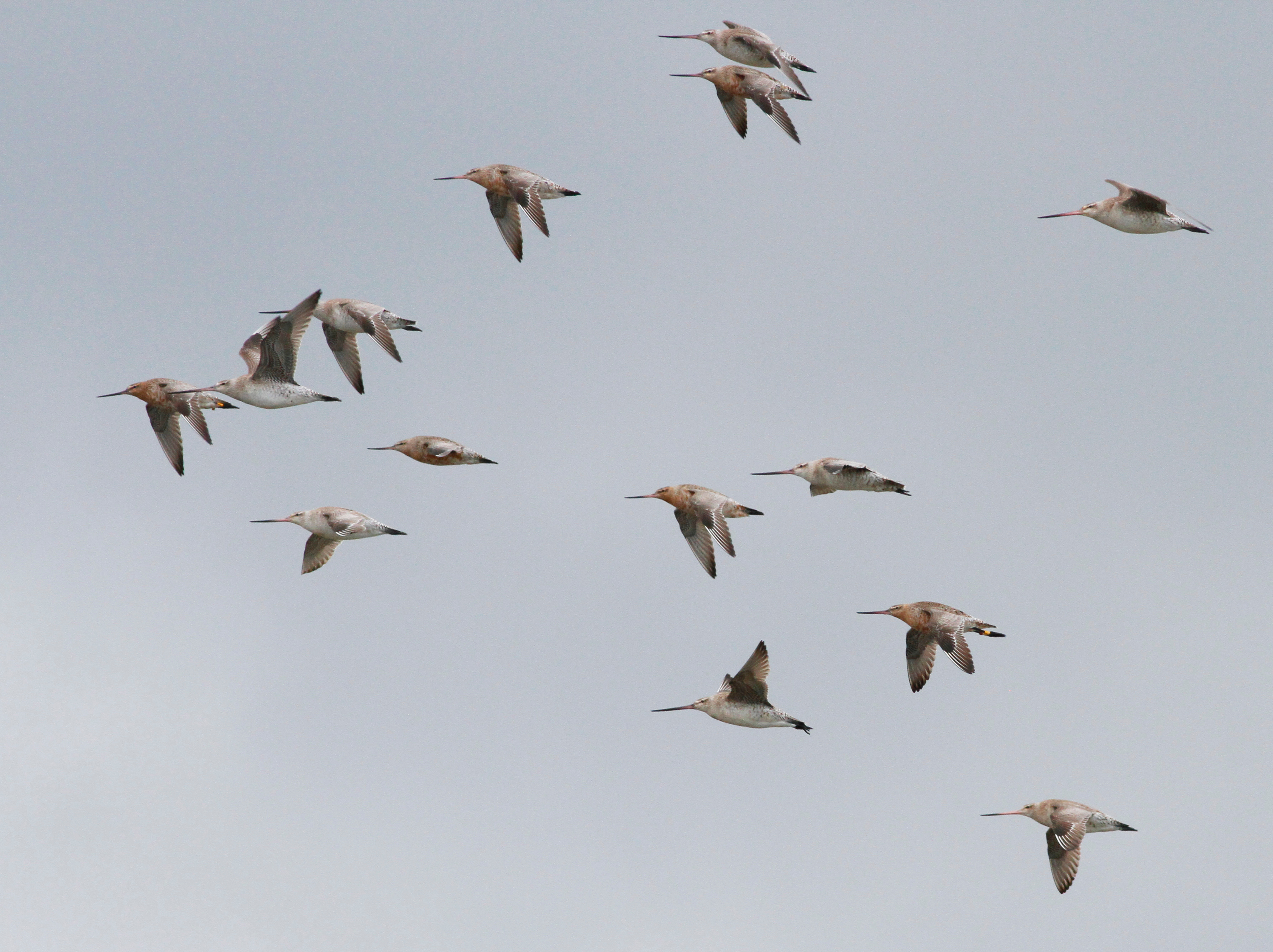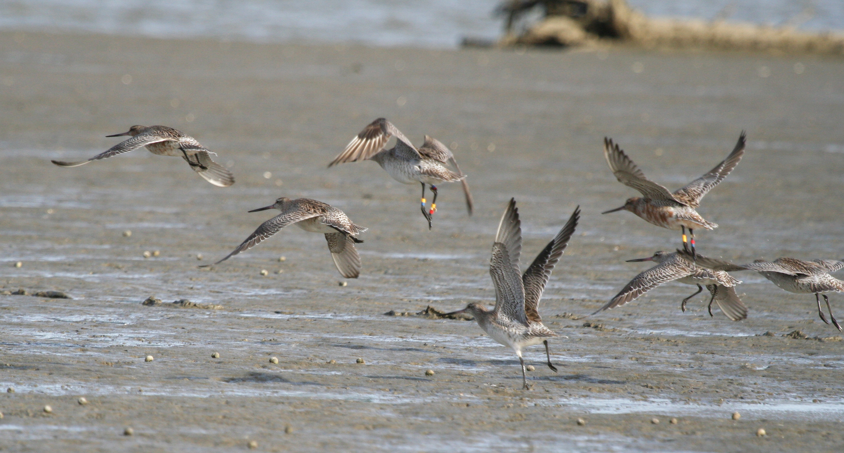 This piercing series of staccato notes is usually attached to a male Bar-tailed Godwit, showing off for a rival or prospective mate on the Alaskan tundra. But the breeding season will not start for nearly two months, and the call is coming from a bird at the Manawatu River estuary in New Zealand, more than 11,000 km straight-line distance from the closest nesting site. Here, this call has a different meaning. Some combined influence of date (6 March), time of day (just after 6 pm), and wind (~30 kph, edging toward southeast) has at least one godwit thinking about flying north, and voicing this thought to anyone within hearing. Pivoting my spotting scope toward the intermittent call, I eventually discover the caller. It is 4YYRB, and I stop wondering why I have come all this way.