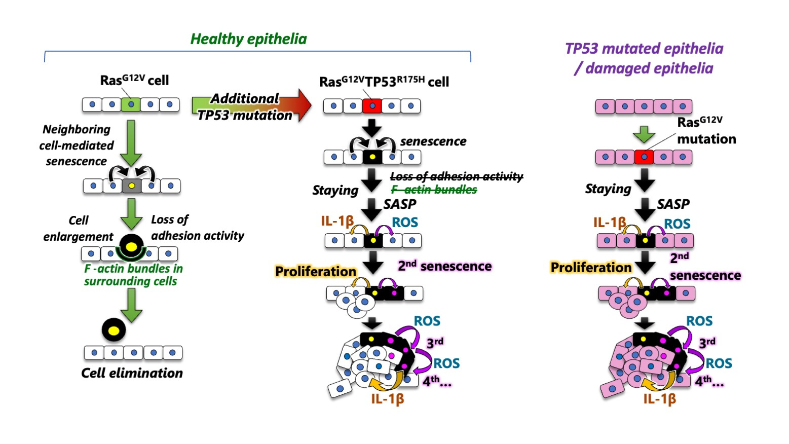 (5) RasG12V cells efficiently form heterogeneous tumors through secondary senescence in damaged or TP53-activated epithelia, but not in healthy epithelia.Taken together, our study reveals that an additional TP53 mutation switches oncogene-induced senescence from a tumor suppressor to driver, thereby priming tumorigenesis. Previous studies have revealed two tumor-suppressive mechanisms of cellular senescence (Collado and Serrano, Nat. Rev. Cancer 2010; Gorgoulis et al., Cell 2019). The first is the induction of irreversible cell cycle arrest in oncogenic cells. The second is the stimulation of immune cell-mediated senescent cell elimination. In this study, we discovered immune cell-independent oncogenic cell elimination as a third anti-tumor mechanism of cellular senescence.