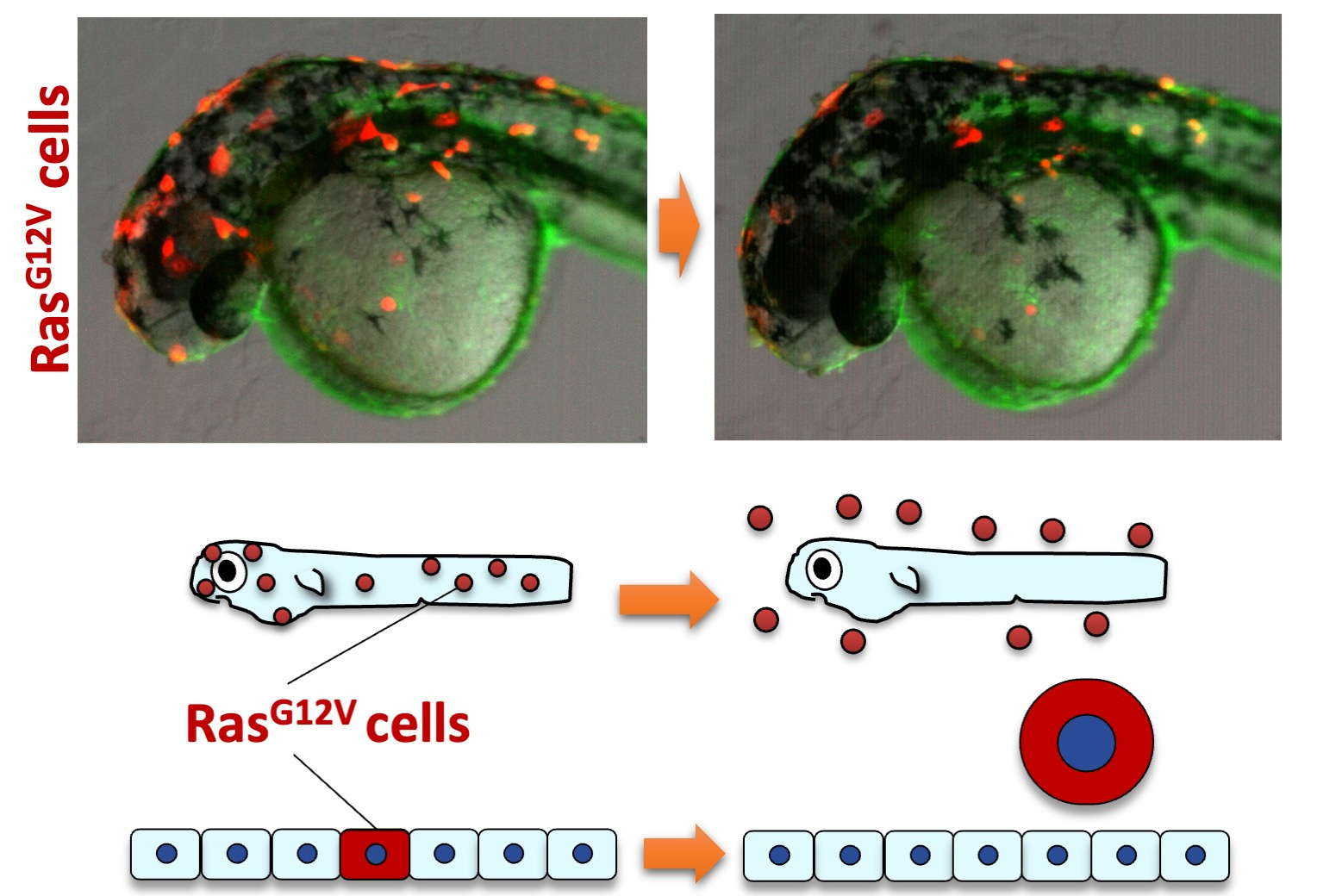 (1) A newly emerged oncogenic cell with the RasG12V mutation becomes senescent through communication with neighboring cells and is eliminated from the zebrafish epithelia.