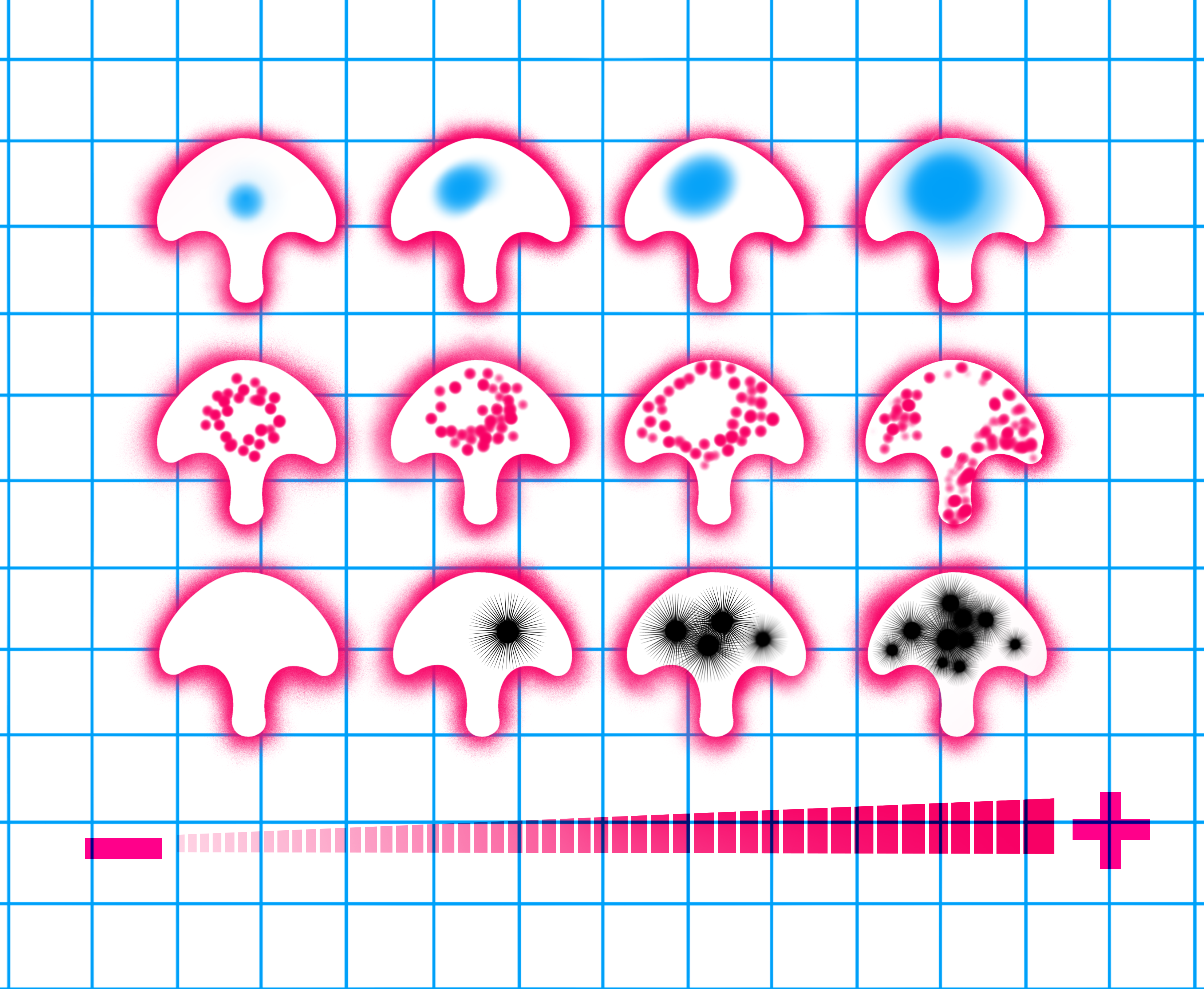 The image illustrates the comparison of normal human urothelium (NHU) cells, on the left, to bladder cancer cells of different grades, on the right, employing culturing techniques on identical microscale adhesive surfaces that we call micropatterns4. The nucleus is shown in blue, the lysosomes are in red and the black stars represent cancer progression. We observe a correlation between organelle changes and cancer progression indicated by – to +. Illustration: Apolline Boureau@EPSAA