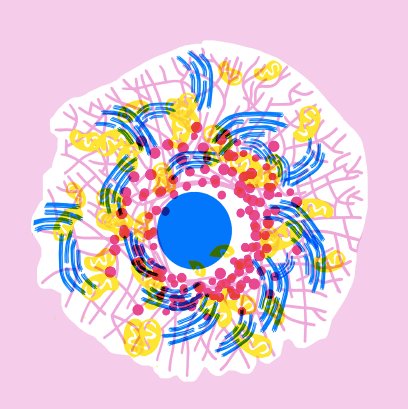 The image is an artistic illustration of a cell with its organelles. Organelles are the smallest functional units of cells found in our body. The nucleus and Golgi stacks are shown in blue, the lysosomes are in red, the mitochondria in yellow and the endoplasmic reticulum in rose. Although several atlases of genomic and proteomic alteration of cancer cells have been established, no atlas of organelle-level changes has been profiled till date. Illustration: Apolline Boureau@EPSAA