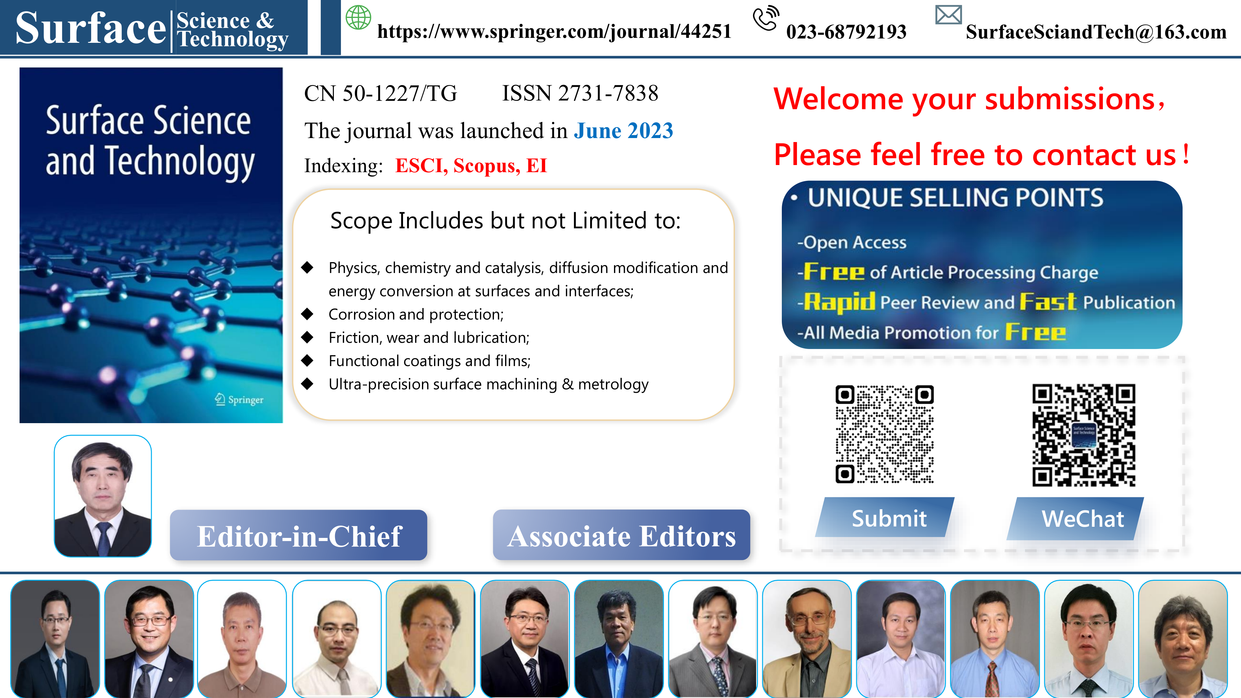 We have a strong editorial board and a high-performance academic publishing group to ensure an efficient and standardized operation, promoting our academic influence in the world. This journal focuses on the research work in the fields of surface science, including surface interface physics, chemistry, catalysis; surface interface diffusion modification and energy conversion; functional coatings and films; corrosion and protection; friction wear and lubrication; and ultra precision surface machining and metrology.