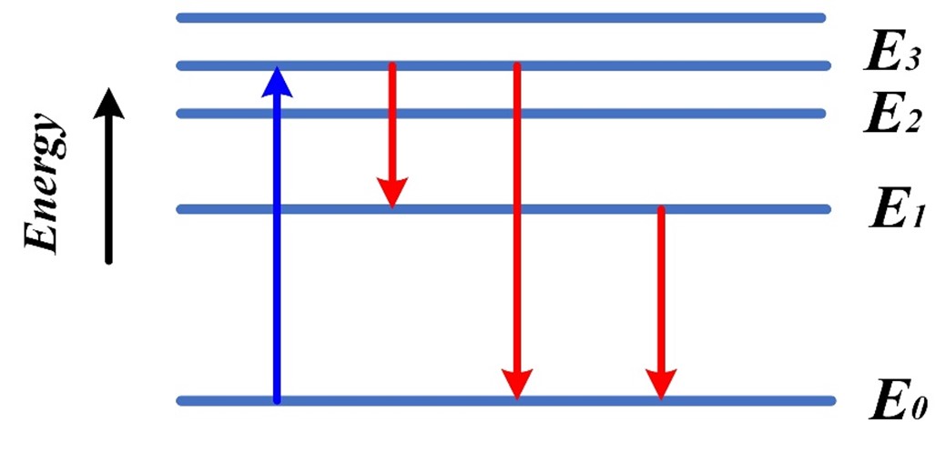 Let’s go back to the simultaneous emission-detection phenomenon of the QWD. We will combine Einstein’s equation, Planck’s equation, irreversible process and energy diagram theory to answer why the device can only shorter-wavelength photon than that emitted by itself. Figure 1 illustrates a schematic energy diagram for a QWD, wherein the energy is plotted vertically and the horizontal lines are for each allowed values of the energy E0, E1, E2, E3. The energy E0 in the valence band is the lowest possible condition, and several possible transitions are demonstrated. When we inject current into the diode, the electrons in one of these conduction bands absorb energy to drop to a lower state and radiate energy in the form of light. According to the law of the conservation of energy and Planck’s equation, the frequency of the emitted light is determined by the difference in the energy. For example, the frequency of the light which is liberated in a transition from energy E3 to energy E0 is