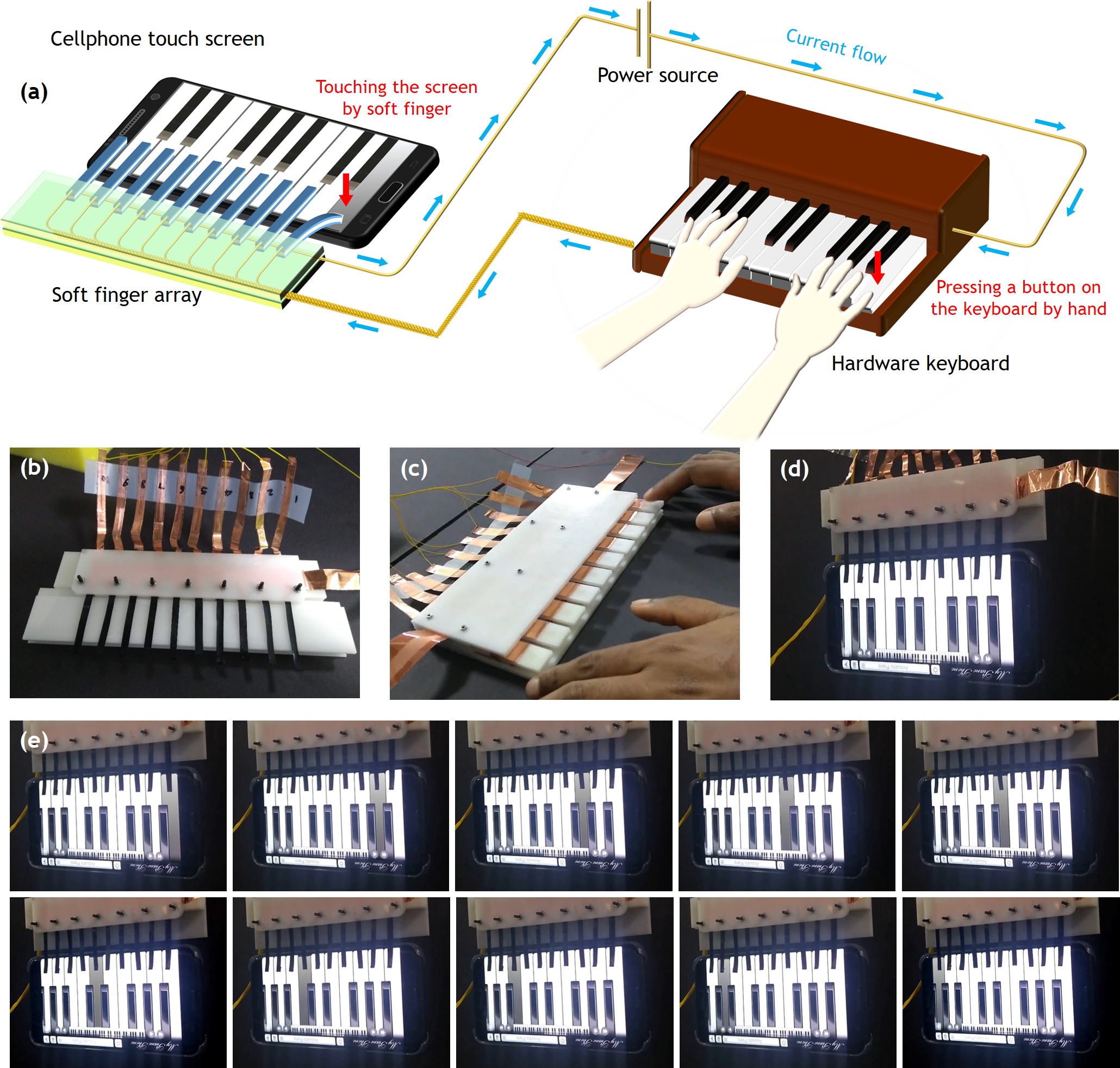 Figure 1. Fabrication and operation of soft robotic fingers array. (a) Schematic illustration for the working principle of soft robotic fingers array based on a lab designed hardware and controlled by human fingers array. (b) Chronological arrangement of the AWIS actuators with respective electrical connections of the fabricated artificial robotic fingers array. (c) The hardware keyboard, designed to switch the input stimulation between the actuators. (d) The artificial hand mounted on the touch screen, which is running a piano App. (e) Operation of all soft touch fingers of the artificial robotic hand by applying input stimulation to play piano for “happy birthday” song.
