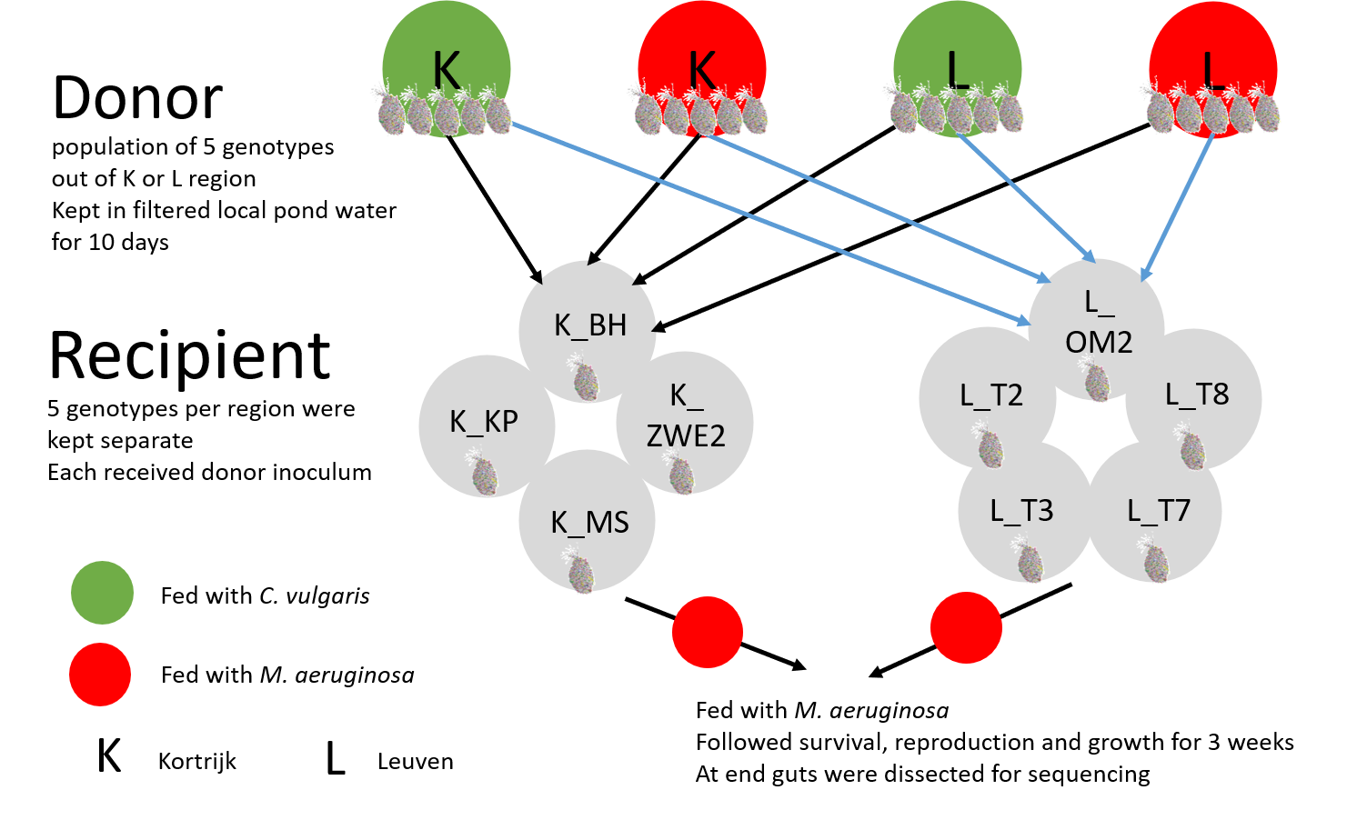 To investigate if Daphnia have a locally adapted gut microbiome, we performed a transplant experiment where Daphnia were inoculated with a sympatric (i.e. from the same region) or allopatric (i.e. from a different region) microbiome that was pre-exposed to toxic cyanobacteria or not (Figure 2). We found that Daphnia have a higher fitness in terms of survival and fecundity when they received a sympatric than allopatric microbiome. We could also link this higher fitness with microbiome diversity. In some Daphnia fitness was high while bacterial diversity was low, suggesting selection of certain (beneficial?) microbiome strains. While in others both fitness and bacterial diversity was high, suggesting selection of a high bacterial diversity to have a wide array of complementary gene functions.