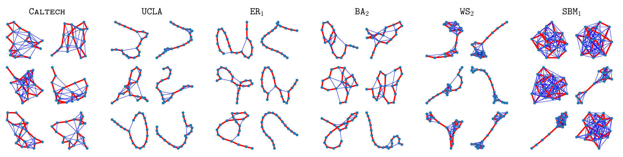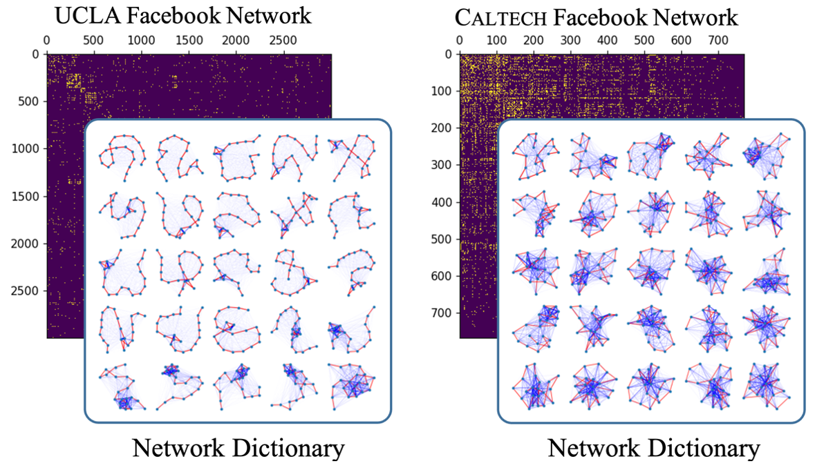 The figure above shows examples of 20-node subgraphs that include a path (in red) that spans the entire subgraph. These subgraphs are subsets of various real-world and synthetic networks. The depicted subgraphs have diverse connection patterns, which depend on the structure of the original network. One of our key findings is that roughly speaking, these subgraphs have specific patterns. Specifically, we find that many real-world networks possess a small set of latent motifs that effectively approximate most subgraphs at a fixed mesoscale. The figure below shows "network dictionaries" of 25 latent motifs for Facebook “friendship” networks from the universities UCLA and Caltech Facebook. By using subgraph sampling and nonnegative matrix factorization, we are able to discover these latent motifs.