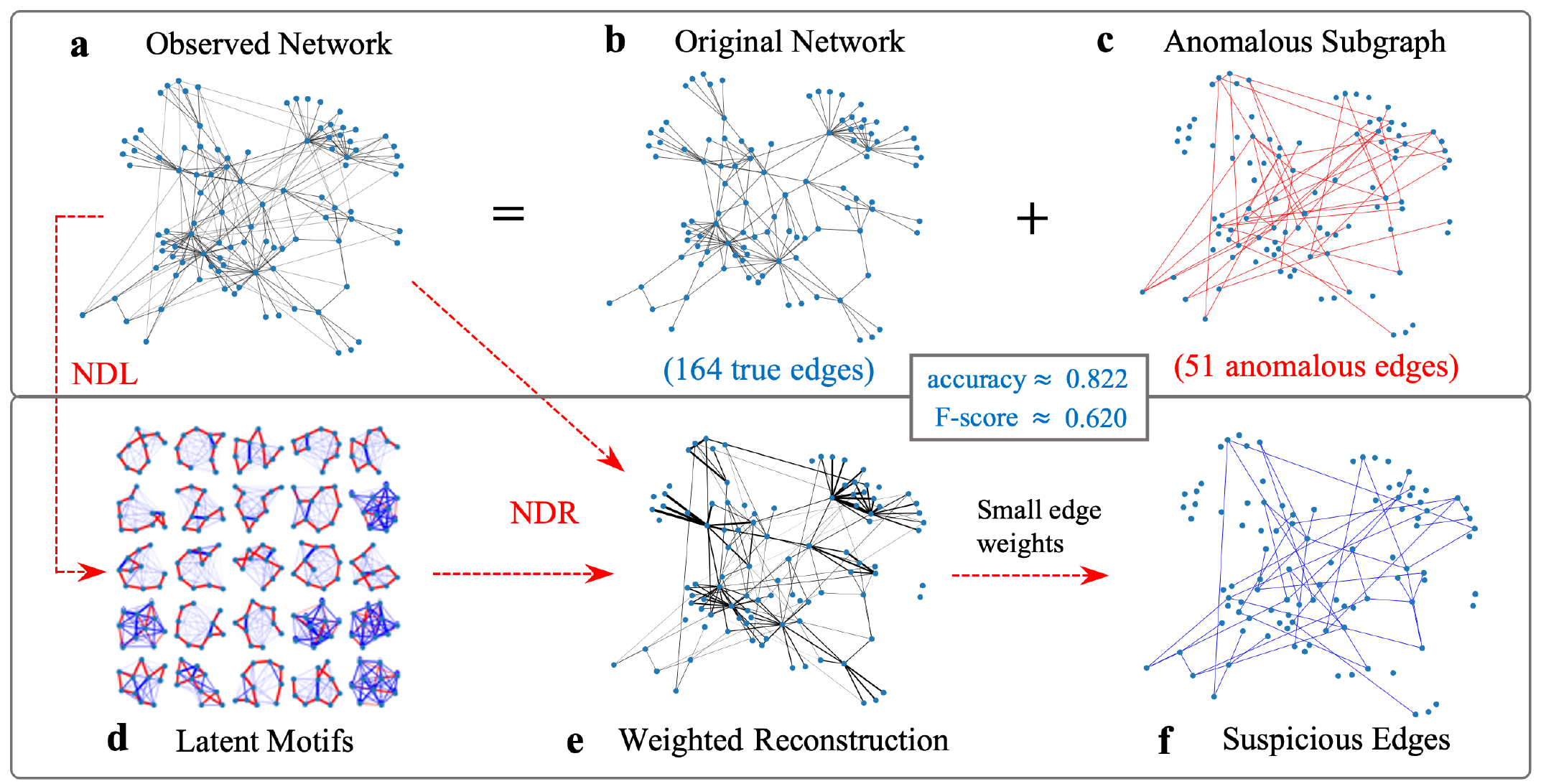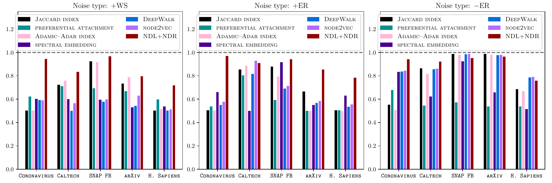 Our method can also be used for "link-prediction" problems, in which one seeks to figure out the most likely new edges given an observed network structure. The reasoning is similar to that for anomalous-subgraph detection. We learn latent motifs from an observed network and use them to reconstruct the network. The edges with the largest weights in the reconstructed network that were non-edges in the observed network are our predictions as the most likely edges. As we show in the figure below, our latent-motif approach is competitive with popular methods for anomalous-subgraph detection and link prediction.