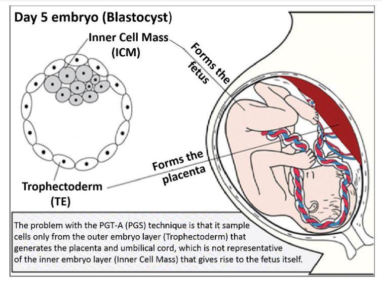 Third, patients should be told that genetic testing involves extracting and sampling cells from the outer embryo layer (trophectoderm) that gives rise to the placenta and umbilical cord. This is not representative of the inner embryo layer (Inner Cell Mass) that goes on to form the actual fetus, which gives rise to the baby. Mosaic embryos, which are embryos with a mixture of genetically normal and abnormal cells, occur quite frequently and commonly among woman undergoing IVF. Genetic testing often leads to the misdiagnosis and discarding of mosaic embryos, which are capable of giving rise to a normal and healthy baby.