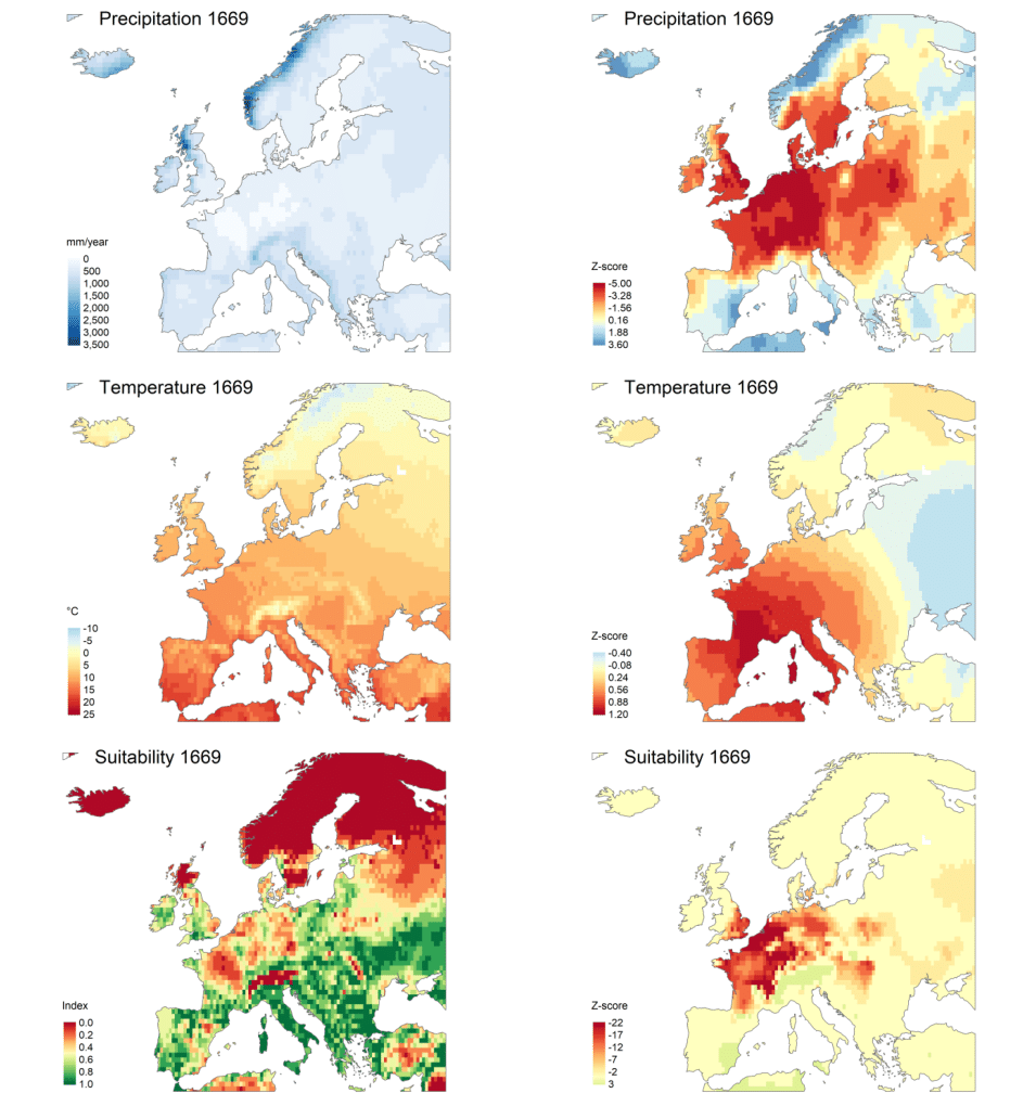 One striking example is the year 1669 (see Figure 2). While Western Europe enjoyed relatively high temperatures—potentially improving crop suitability—Central Europe was hit by extremely low precipitation, with some regions recording deviations of up to five standard deviations below their usual rainfall. This combination of warmth and intense dryness drained the soil of moisture, making large areas of land unsuitable for farming. On the other hand, in more arid areas of Southern Europe and Northern Africa, slightly higher precipitation offset higher temperatures, actually enhancing their overall suitability. These contrasting outcomes highlight why looking at temperature or precipitation alone can be misleading: only by jointly examining these variables, and capturing their non-linear interactions, can we properly account for the short-term weather shocks that shaped agricultural boundaries.