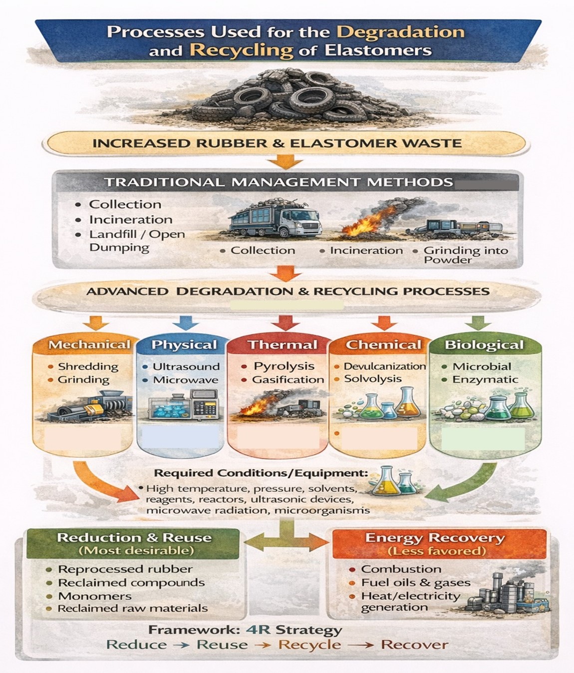 Figure 1. Processes for degrading and recycling elastomers can be used alone or together to reuse, recycle, or recover elastomer waste for energy.