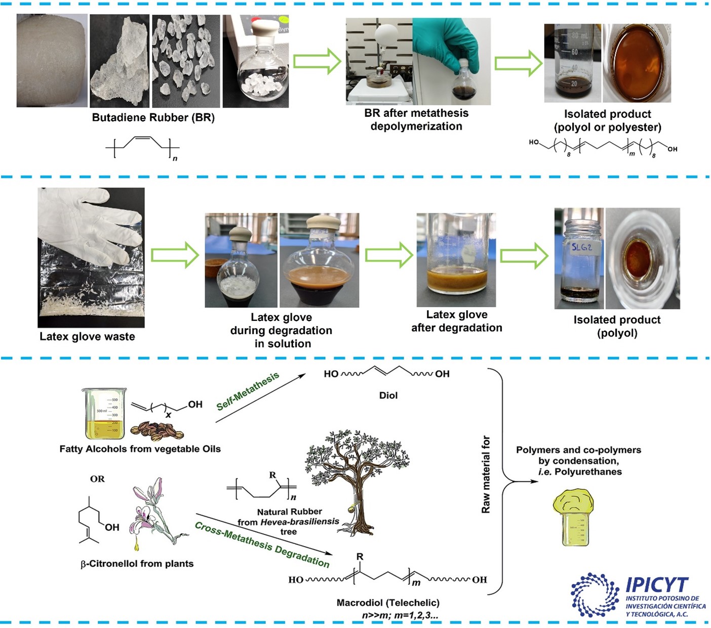 Dr. Manuel Burelo from Instituto Potosino de Investigación Científica y Tecnológica A.C. (IPICYT) in Mexico, in collaboration with the National Autonomous University of Mexico (UNAM) and Tecnologico de Monterrey, has developed a chemical process for depolymerizing elastomers via metathesis. This process is applicable to natural and synthetic rubbers such as NR, IR, BR, SBR, and NBR, as well as industrial waste from rubber or elastomers, including latex, nitrile, and neoprene gloves. This process controls the molecular weight, chemical structure, and functional groups of the resulting products. It produces value-added compounds, including diols, polyols, macrodiols, polyesters, diamines, and polyamides, among others, with various functional groups. These new compounds can be used to develop materials, polymers, and copolymers, serve as raw materials or reaction intermediates, or be employed in fine chemicals, biomedical applications, or polyurethane industries (Figure 2).