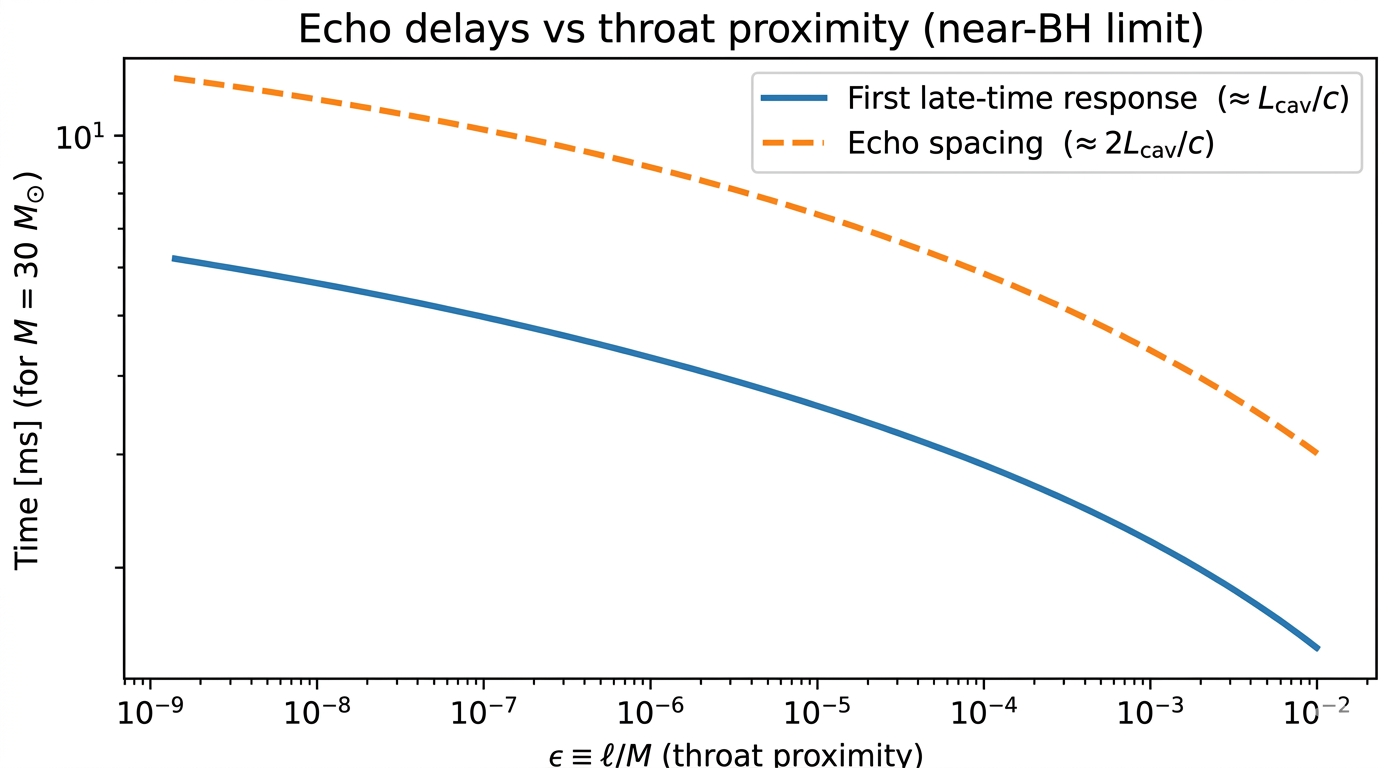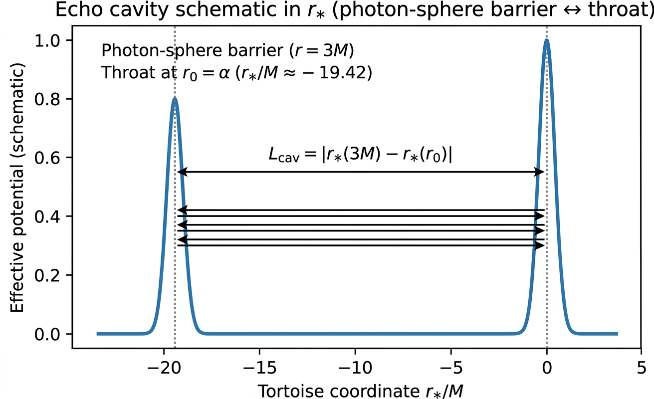 - Gravitational-wave echoes arising from the photon-sphere/throat cavity. The delay between successive echoes scales logarithmically as Δt ~ −(2M/c) ln(ℓ/M) in the near-horizon limit, as shown in Figure 2, with partial reflections between the two potential barriers illustrated in Figure 3.