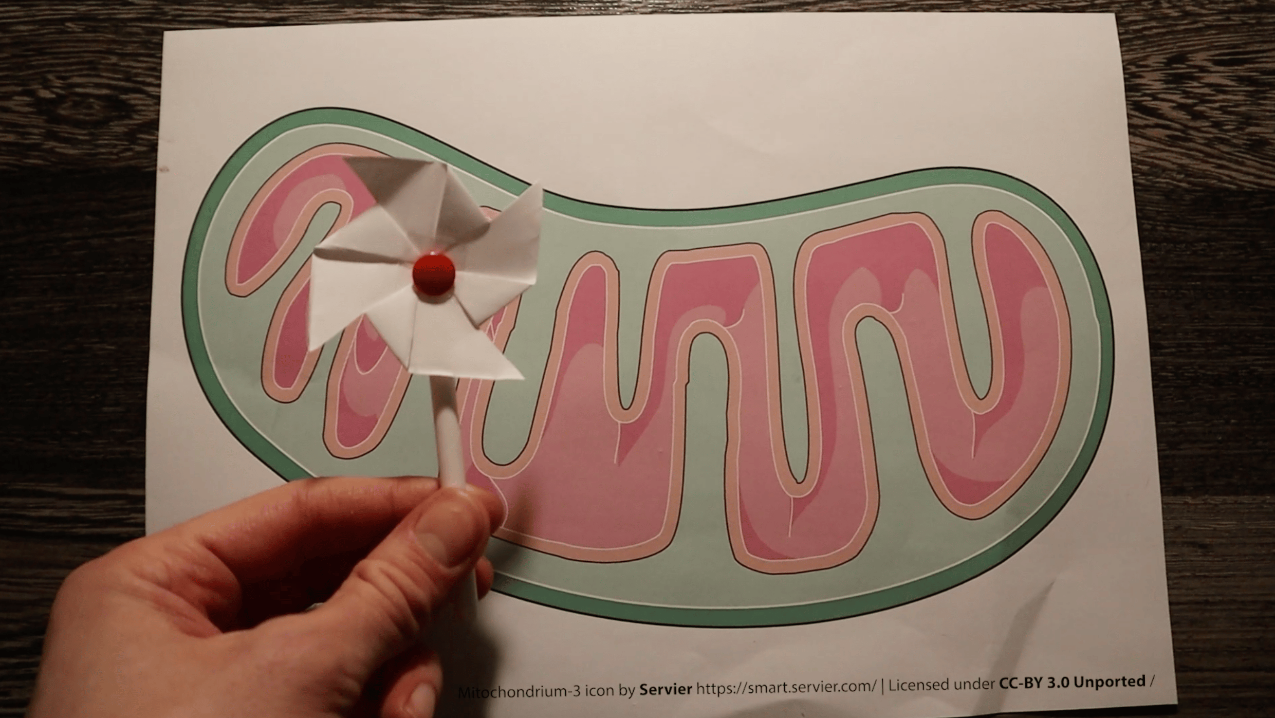 We experimented with active and inactive factories, long and small assembly lines that would represent the change in the mitochondrion's cristae. At some point we thought to make an animation showing a handful of workers in the sun eating sweets and spilling milk as a reference to the consumption of sugars and the production of lactate in the asexual blood-stage parasites that largely rely on glycolysis for their energy production. Although it is a creative scientific metaphor, the message got too complex and the animation fairly difficult to create. Then Cas suggested to use simplified pictures of the different shapes the mitochondria adopt during the different stages and represent the protein complexes involved in classical mitochondrial energy production by beads on a string. So I kindly asked my daughter if we could borrow her large wooden beads for the occasion. While the symbolism was much simpler and conveyed the message well, Cas struggled to record the beads on a string in an appealing manner. And then it suddenly struck me that we should not represent the energy producing machinery by industrial complexes, but by windmills, drawn on the simplified mitochondria, one with a few and the other loaded with mills. Would there be a better way to represent Dutch malaria research? I proposed the idea to Cas who not only loved the idea, but came with the final touch of using crafted paper windmills. Once this idea was in place, it took relatively little time to make the recordings.