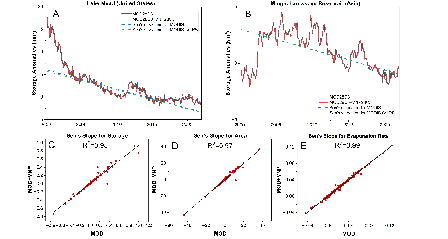 Figure 1. Trend analysis of storage anomalies using the Mann‐Kendall and Sen's slope method for the period of 2012-2021 at (A) Lake Mead (North America) and (B) Mingechaurskoye reservoir (Asia). The black line shows the monthly storage anomalies from MOD28C3, the red line shows the combined monthly storage anomalies from MODIS (from 2000-2012) and VIIRS (from 2012- 2021), the blue dotted line shows the Sen's slope for MODIS, and the green dotted line shows the Sen's slope for the MODIS+VIIRS combined storage anomalies. (C-E) Comparison of the Sen's slope values between MODIS (MOD) and MODIS+VIIRS (MOD+VNP) for all 164 reservoirs with respect to (C) storage anomalies, (D) area anomalies, and (E) evaporation rate anomalies.